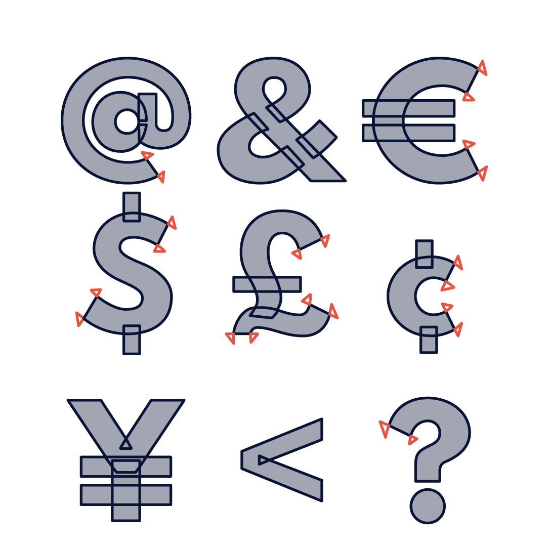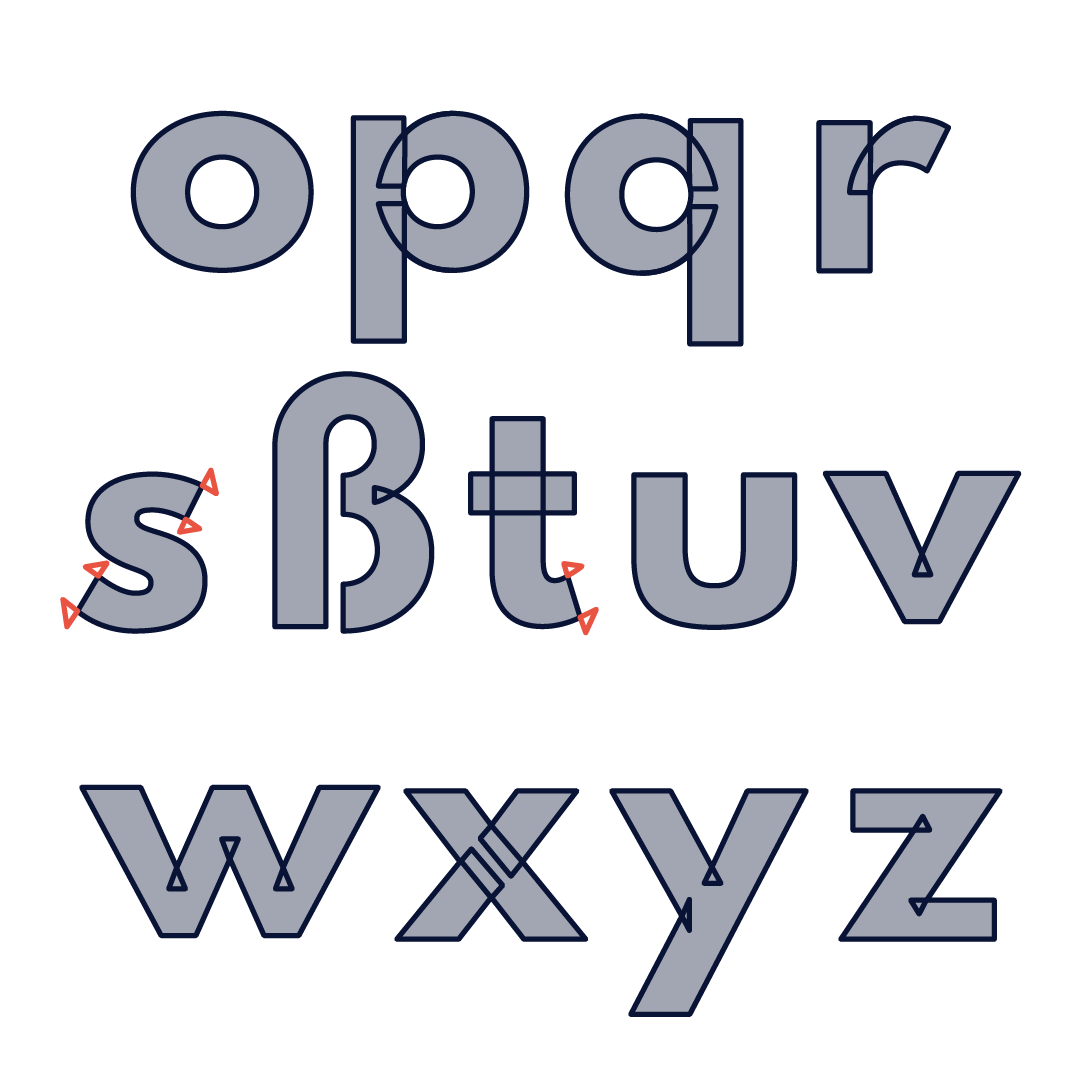 When you draw your letterforms you have to keep in mind that you use as few points as possible, while maintaining as much possible control over the shape of your lines. In Type Design software like Glyphs, which we use in our Type Design Courses, you can use Open Corners on curved paths like in the C, this allows you to move the end stoke along the curve. Super handy to quickly change the shape of your character and keep the curves. Keep in mind that this does not work in Adobe Illustrator.